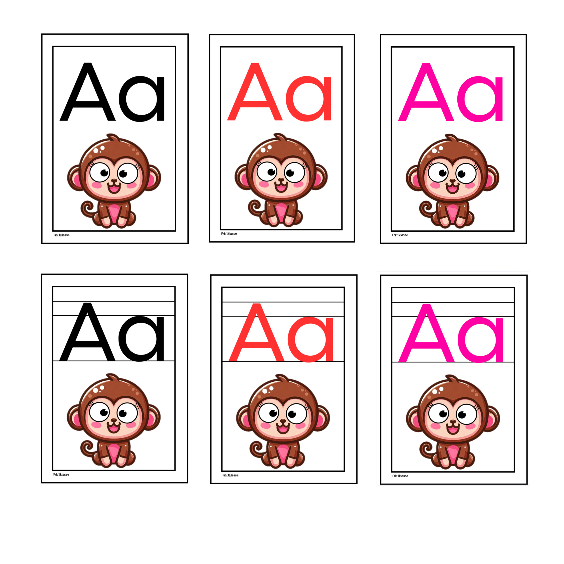 Ren og stilfull variant av alfabetplakatene – med eller uten bokstavhus – begge i helhvit bakgrunn med tydelige og barnevennlige illustrasjoner. Hvit ramme. Totalt 96 plakater!