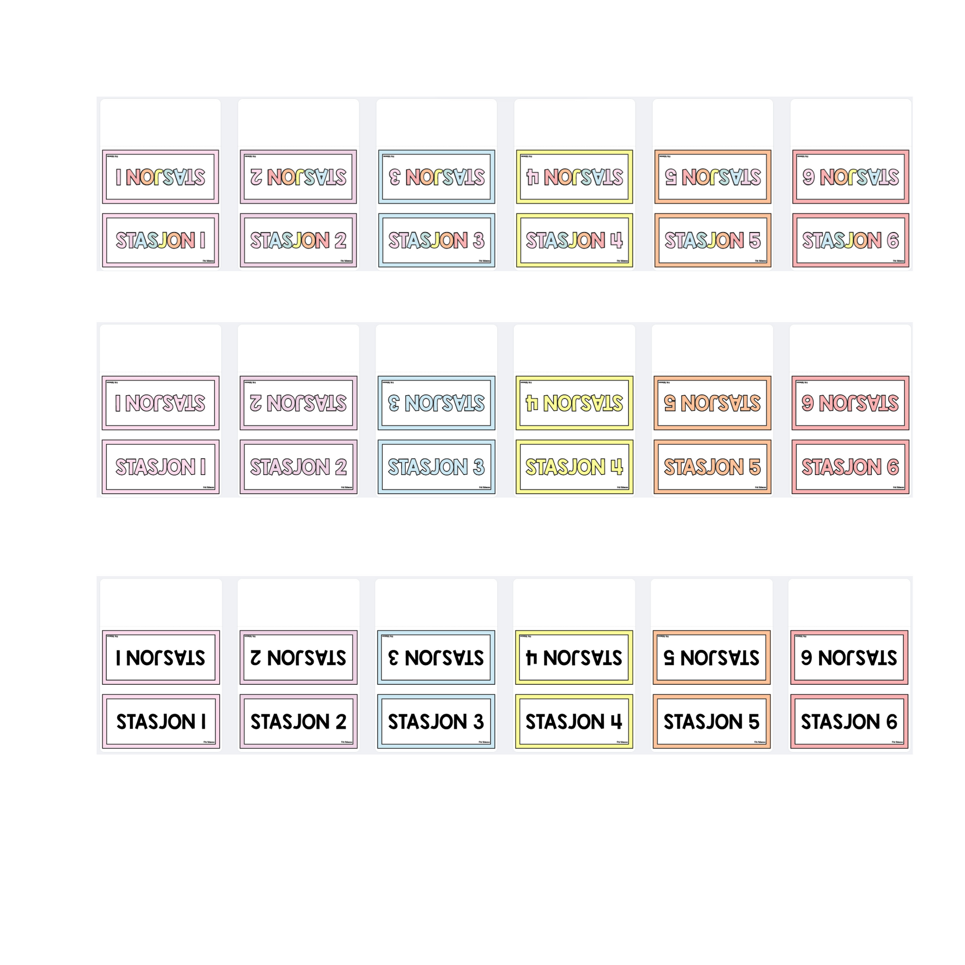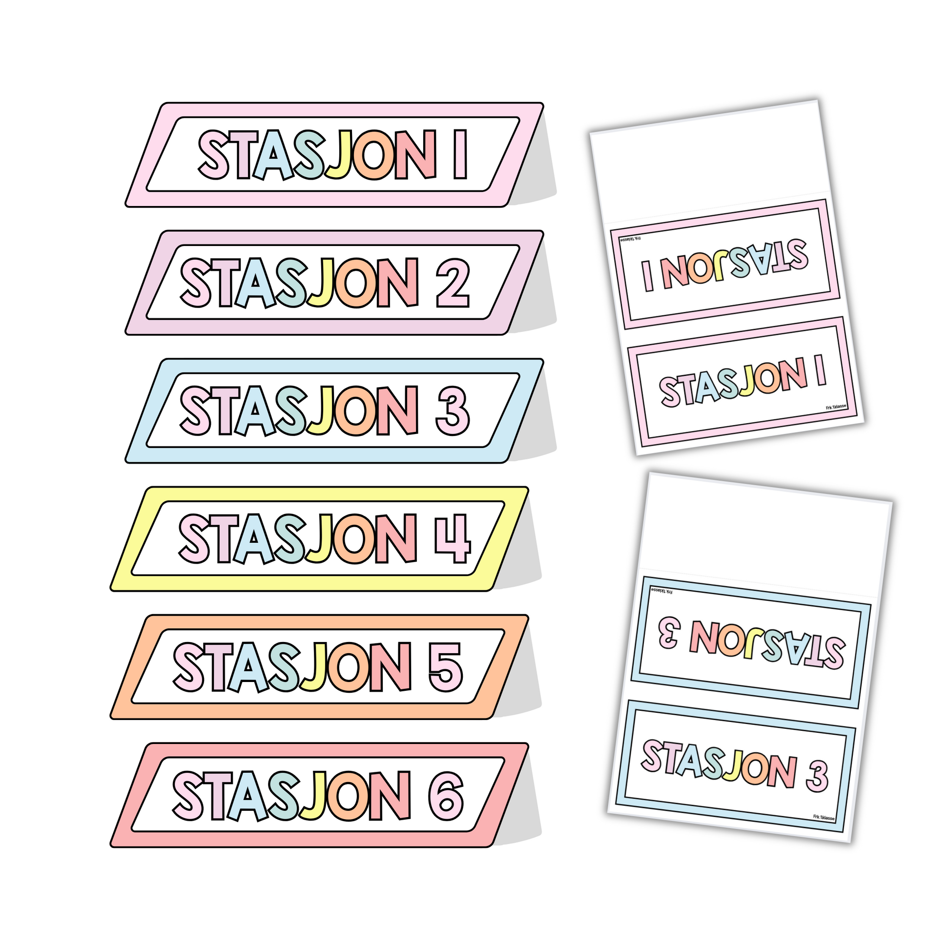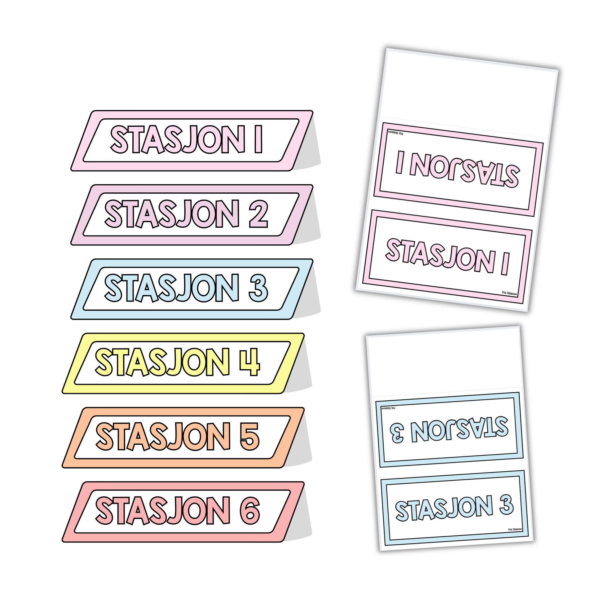 Skilt med stasjon 1, 2, 3 osv. i et rolig og behagelig pastellfargetema.